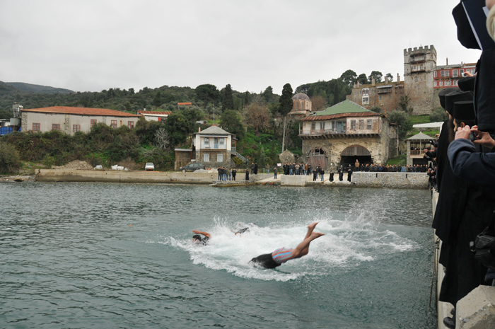 Η λιτανεία έγινε με βασικό συνοδό την εικόνα της Παναγίας της Βηματάρισσας, αλλά και τον χορό των Πατέρων της Μονής, τους μοναχούς και τους προσκυνητές. Όλοι κατεβήκαμε στον αρσανά. Κάποιοι γενναίοι βούτηξαν για να ανελκύσουν το Σταυρό ακολουθώντας το έθιμο και πήραν ευλογία από τον επίσκοπο και τον ηγούμενο.