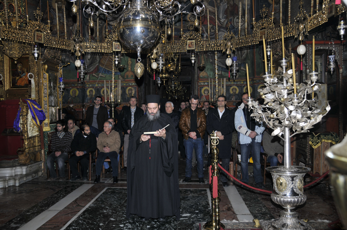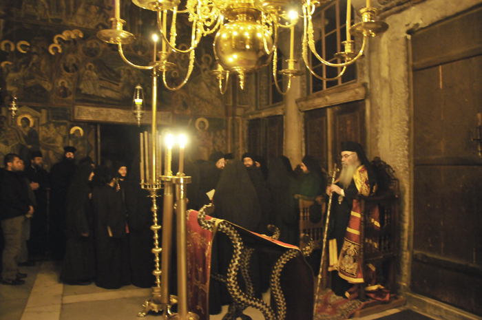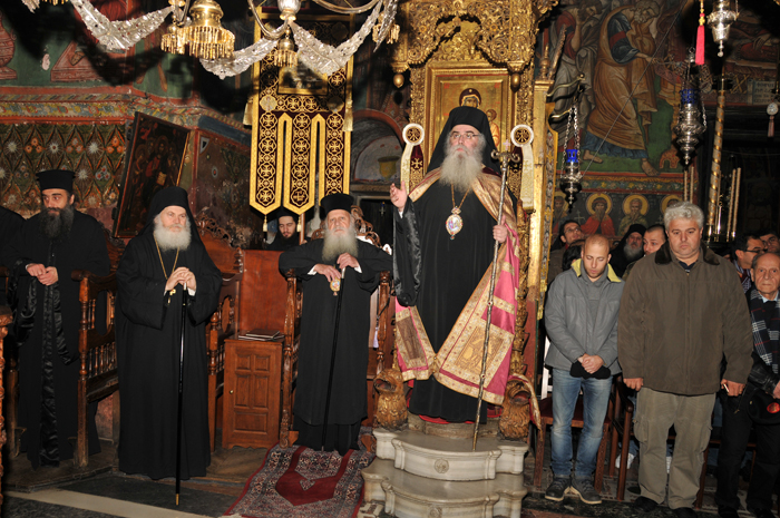 Περί τις 20:00 πήγαμε στο Συνοδικό της Μονής όπου μας μίλησε ο Γέροντας Εφραίμ. Μετά την ψυχωφελή συζήτηση έφτασε και η ώρα της αγρυπνίας. Μπαίνοντας στο νάρθηκα, συναντήσαμε τον Μητροπολίτη Καστορίας κ.κ. Σεραφείμ που πρωτοστάτησε ευλαβικά σε ολόκληρη την ακολουθία. Μας εντυπωσίασε ιδιαίτερα το «μάθημα» της Λιτής που ψάλλανε οι πατέρες.