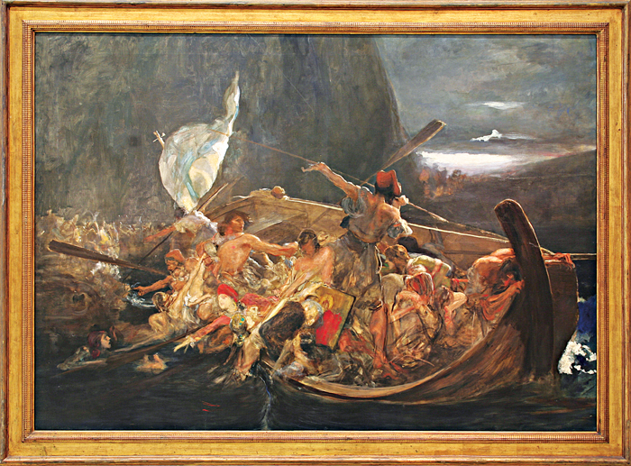 Η βάρκα τώρα είναι εκτελεσμένη με σαφήνεια σε πλήρη προοπτική απόδοση, η καρίνα -άν και είναι κατάμαυρη καμπύλη- με τα φώτα που έχει ριχθεί στο επάνω μέρος της έχει μεταβληθεί σε πολιορκητικό κριό που σχίζει τα ταραγμένα κύματα μέσα στην άγρια και εφιαλτική νύχτα. Παράλληλα, οι κουπαστές και από τις δυο πλευρές φωτίζονται με ανοιχτόχρωμες ώχρες, σαν να θέλει να οριοθετήσει τον χώρο της. Οι μορφές και τα αντικείμενα που ζωγραφίζονται κατανέμονται οργανικά και συνθετικά μέσα στην βάρκα, μερικά στοιχεία που βάραιναν την σύνθεση παραλείπονται. Αντιθέτως, σημεία που τόνιζαν την τραγικότητα τώρα γίνονται περισσότερο εκφραστικά και δυνατά.