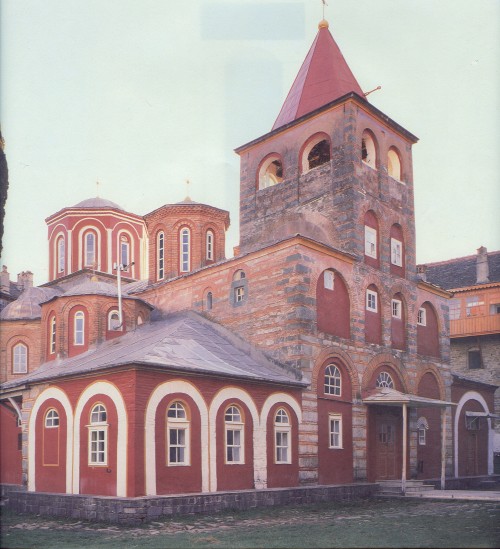 Ο κυριαρχικός ρόλος του καθολικού ως πνευματικού Κέντρου της μονής, εκφράζεται στο επίπεδο της κτιριακής σύνθεσης με την τοποθέτησή του στο γεωμετρικό κέντρο του συγκροτήματος. Ιδιαίτερα χαρακτηριστική, όσον αφορά μάλιστα τα αγιορείτικα καθολικά, είναι η περιγραφή που δίνεται σε μια βιογραφία («Βίος Β») του Οσίου Αθανασίου του Αθωνίτη, γραμμένη γύρω στο τέλος του 11ου αιώνα, σχετικά με την κτιριακή οργάνωση της μονής Μεγίστης Λαύρας: « … Και μετά τούτο της των κελλίων απαρξάμενος οικοδομής κύκλω ταύτα της εκκλησίας κατεσκεύασεν εν τετραγώνω σχήματι, κελλίον το κελλίον συνάψας, ώντινων μέσω ίσταται η εκκλησία, ώσπερ τις οφθαλμός βλεπόμενος πάντοθεν ,..». Η περιγραφή αυτή για την συγκρότηση της αρχαιότερης αγιορείτικης μονής, που υπήρξε το πρότυπο και για τις υπόλοιπες, αποδίδει με ακρίβεια, και με τα σημερινά ακόμα δεδομένα, τον χαρακτήρα της κτιριακής οργάνωσης των μοναστηριών του Αγίου Όρους.