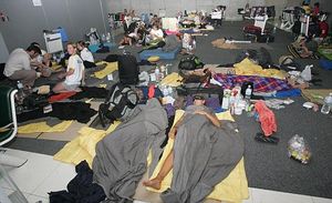 Stranded: Hundreds of desperate Britons sleep on the basement floor at Bangkok’s International Airport, Thailand waiting to get flights home.