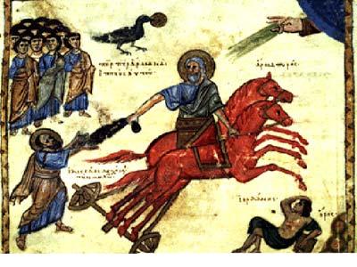 Saint Elijah, one who saw God, a miracle-worker and a zealot for faith in God, was born of the tribe of Aaron from the town Tishba for which he was called the Tishbite. When St. Elijah was born, his father Savah saw an angel of God hovering around the child, wrapping the child in fire and giving him a flame to eat. That was a foreshadowing of Elijah’s fiery character and his God-given fiery power. He spent his entire youth in godly thoughts and prayers withdrawing frequently into the wilderness to contemplate and to pray in solitude. At that time the Jewish kingdom was divided into two unequal parts: the kingdom of Judah consisting of only two tribes, the tribes of Judah and Benjamin with their capital in Jerusalem and the kingdom of Israel consisting of the remaining ten tribes with their capital in Samaria. The first kingdom was governed by the descendants of Solomon and the second kingdom was governed by the descendants of Jeroboam, the servants of Solomon. The greatest confrontation that the prophet Elijah had was with the Israelite King Ahab and his evil wife Jezebel. For they, Ahab and Jezebel, worshipped idols and were turning the people away from serving the One and Living God. Before this, however, Jezebel, a Syrian, persuaded her husband to erect a temple to the Syrian god Baal and ordered many priests to the service of this false god. Through great miracles Elijah displayed the power and authority of God: he closed up the heavens, so that there was not any rain for three years and six months; he lowered a fire from heaven and burned the sacrifice to his God which the pagan priests of Baal were unable to do; he brought down rain from heaven by his prayer; miraculously multiplied flour and oil in the home of the widow in Zerepath, and resurrected her son; he prophesied to Ahab that the dogs will lick up his blood and to Jezebel that the dogs will consume her flesh, all of which happened as well as many other miracles did he perform and prophesy. On Mount Horeb, he spoke with God and heard the voice of God in the calm of a gentle breeze. Before his death he took Elisha and designated him as his successor in the prophetic calling; by his mantle he divided the waters of the Jordan river, finally he was taken up into the heavens in a fiery chariot by flaming horses. He appeared on Mount Tabor to our Lord Jesus Christ together with Moses. Before the end of the world St. Elijah will appear again to put an end to the power of the anti-Christ (Revelation, Chapter 11).
