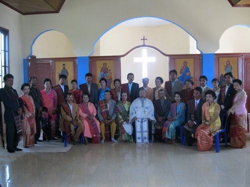 Β.Ο π.Χρυσόστομος με μέλη της νέας Ορθόδοξης κοινότητας στο χωριό Pargambiran μπροστά στυον προσωρινό ναό