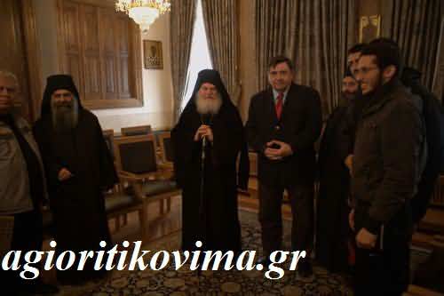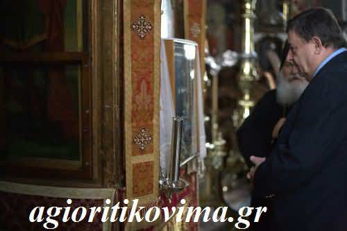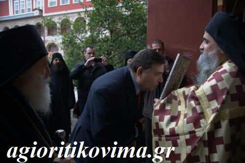 Απο τους πλευρά τους οι μοναχοί με επικεφαλής τον ηγούμενο Εφραίμ επιφύλαξαν στο κ. Καρατζαφέρη θερμή υποδοχή,οπως συνηθίζεται,που ξεκίνησε απο την πύλη και κατέληξε στον κεντρικό Ναό της Μονής. Εκεί έγινε προσφώνηση απο τον ηγούμενο Εφραίμ και στη συνέχεια η αντιφώνηση απο τον πρόεδρο. ΄΄Ηρθα να προσκυνήσω στο Άγιο Όρος με πολύ ενδιαφέρον για την ορθοδοξία και την Εκκλησία.Απο το 1453 μέχρι σήμερα τα δυο ΄΄πόδια΄΄ της Ελλάδας είναι η εθνική υπόσταση της φυλής της κι η Ορθοδοξία.Το ένα πόδι είναι η Εθνική υπόσταση της φυλής και το άλλο πόδι η Ορθοδοξία.Δεν μπορεί να υπάρχει πατρίδα με ένα πόδι.΄΄τόνισε με ιδιαίτερη έμφαση ο κ.Καρατζαφέρης.