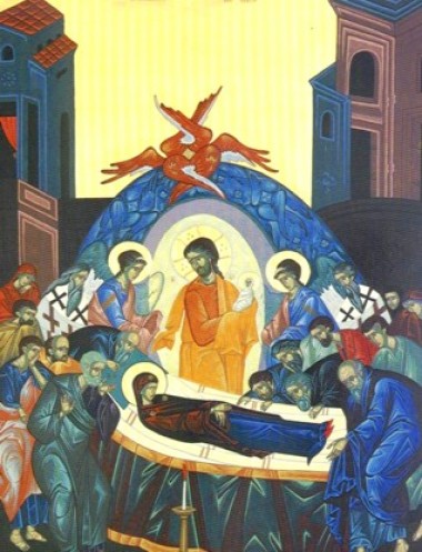 Come, let us depart with her. Come, let us descend to that tomb with all our heart’s desire. Let us draw round that most sacred bed and sing the sweet words, «Hail, full of grace, the Lord is with you. Hail, predestined Mother of God. Hail, you chosen one in the design of God from all eternity, most sacred hope of earth, resting-place of divine fire, holiest delight of the Spirit, fountain of living water, paradise of the tree of life, divine vine-branch, bringing forth soul-sustaining nectar and ambrosia. Full river of spiritual graces, fertile land of the divine pastures, rose of purity, with the sweet fragrance of grace, lily of the royal robe, pure Mother of the Lamb of God who takes away the sin of the world, token of our redemption, handmaid and Mother, surpassing angelic powers.» Come, let us stand round that pure tomb and draw grace to our hearts. Let us raise the ever-virginal body with spiritual arms, and go with her into the grave to die with her. Let us renounce our passions, and live with her in purity, listening to the divine canticles of angels in the heavenly courts. Let us go in adoring, and learn the wondrous mystery by which she is assumed to heaven, to be with her Son, higher than all the angelic choirs. No one stands between Son and Mother. On your departure, in lowly reverence to the Holy Trinity to whom you didst minister, the goodness of the Father, the power of the Spirit, receiving the Uncreated Word, the Almighty Wisdom and Power of God. Heal our passions, cure our diseases, help us out of our difficulties, make our lives peaceful, send us the illumination of the Spirit. Inflame us with the desire of your son. Render us pleasing to Him, so that we may enjoy happiness with Him, seeing thee resplendent with your Son’s glory, rejoicing for ever, keeping feast in the Church with those who worthily celebrate Him who worked our salvation through thee, Christ the Son of God, and our God. To Him be glory and majesty, with the uncreated Father and the all-holy and life-giving Spirit, now and for ever, through the endless ages of eternity. Amen.