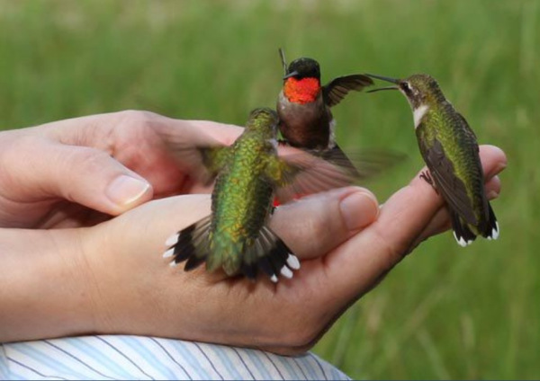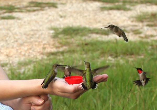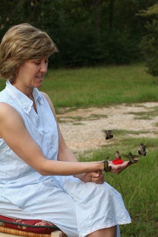 The woman is Abigail Alfano of Pine, Louisiana – she had been studying them daily and one morning put the cup from the feeder (with water in it) into her hand. Since they had gotten used to her standing by the feeder they came over to her hand.
