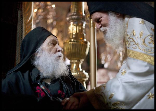 The old monk just came in the church and sat down, being old. His Abbot saw him and even if he was in the middle of the Liturgy, he came to the elder and gave him a handshake to give his old monk a little bit of courage, a little bit of joy…See photo