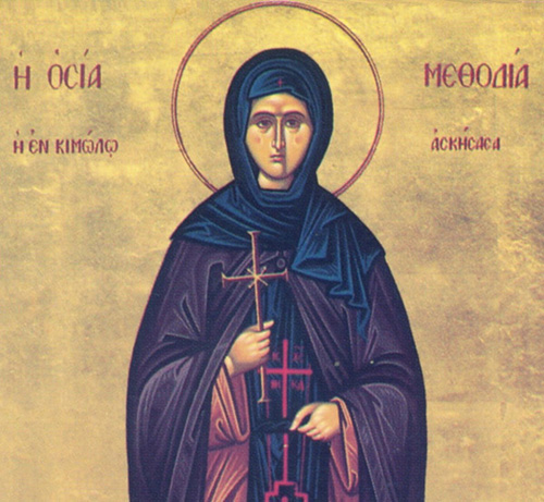 Ή οσία Μεθοδία γεννήθηκε το 1865 στην Κίμωλο των Κυκλάδων, από γονείς ευσεβείς και θεοφοβούμενους. Ήδη από τά παιδικά της χρόνια, επιθυμούσε να αφιερωθεί ολοκληρωτικά στην υπηρεσία του Θεού και της άγιας Εκκλησίας• αποστρεφόταν τις εγκόσμιες απολαύσεις και χαιρόταν μόνον μέ ό,τι ήταν ωφέλιμο στην ψυχή. Οί γονείς της, παρά τις αντιρρήσεις της, της έδωσαν σύζυγο εν αν ναυτικό πού καταγόταν από τή Χίο. Λίγο μετά τον γάμο όμως, ο σύζυγος της χάθηκε στή θάλασσα ενώ ταξίδευε προς τή Μικρασία. Ή μακάρια γυνή ξεπέρασε τή φυσική θλίψη και επωφελήθηκε από το σημείο αυτό πού της έστειλε ο Θεός για να πραγματοποιήσει εκείνο πού επιθυμούσε από τά βάθη της καρδιάς της: ένεδύθη το αγγελικό Σχήμα και έλαβε το όνομα Μεθοδία. Κατόπιν, ως ελαφος διψώσα πού επιποθεί τάς πηγάς των υδάτων (Ψαλμ. μα’), αποσύρθηκε από κάθε επαφή μέ τον κόσμο και κλείσθηκε σ’ ενα στενό κελλί πού βρισκόταν κοντά στο κάστρο του νησιού, ώστε απερίσπαστη να αφιερωθεί αδιαλείπτως στή θεωρία και στή μελέτη των ουρανίων πραγμάτων. Έβγαινε από το κελλί της μόνο όταν τήν καλούσε ή αγάπη προς τον πλησίον. Περνούσε όλη της τήν ήμερα μέ άσκηση και προσευχή και μετά από λίγη αναγκαία ανάπαυση, αγρυπνούσε όλη τή νύκτα, προσευχομένη μετά κατανύξεως και δακρύων, στρεφόμενη προς τον νυμφίο Χριστό μέ τους νοερούς οφθαλμούς της ψυχής. Νήστευε αυστηρά όλες τις ήμερες της εβδομάδος, έκτος από το Σάββατο και την Κυριακή, όταν εξερχόταν από το ησυχαστήριο της γιά να κοινωνήσει τά άχραντα Μυστήρια σέ μία γειτονική εκκλησία. «Ολη τη Μεγάλη Τεσσαρακοστή δεν δεχόταν κανέναν επισκέπτη και έμενε κλεισμένη στο κελλί της έως το Πάσχα. Οι ασκητικοί της αγώνες και ή χάρις πού της δόθηκε από τον Θεό ώς μερική ανταπόδοση, έγιναν γνωστές Οχι μόνο σ’ όλη τήν Κίμωλο άλλα και στα γύρω νησιά. Γιά να αποφύγει κάθε πειρασμό δεχόταν μόνο επισκέψεις από γυναίκες, πού προσέτρεχαν στην αγία γιά να λάβουν ανακούφιση σωματική κάι ψυχική, και επέστρεφαν γεμάτες χαρά πού μπόρεσαν να πλησιάσουν μία αληθινή θεοφόρο δούλη του Κυρίου. Ή όσία τους δίδασκε τις οδούς της μετανοίας και τϊς ευαγγελικές αρετές, και τους έδινε λίγο αγιασμένο λάδι από τήν ακοίμητη κανδήλα πού έκαιγε στο κελλί της, ώς σημείο της παρηγοριάς πού εξασφάλιζαν στον καθένα οι αδιάλειπτες προσευχές της. Πολλούς έθεράπευσε κατ’ αυτό τον τρόπο και άφοΰ αγωνίσθηκε καλώς, έκοιμήθη έν ειρήνη, στις 5 Όκτωβρίου 1908, σέ ηλικία σαράντα τριών ετών.