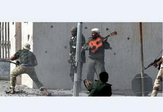 Η φοβερή αυτή φωτογραφία, που δείχνει ένα Λίβυο να παίζει κιθάρα την ώρα που γύρω του μαίνεται μάχη κάνει από χθες το γύρο του κόσμου και φιγουράρει στα πρωτοσέλιδα των διεθνών media.