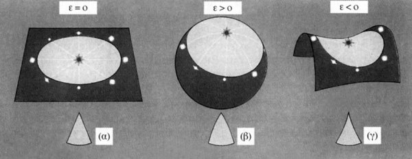 Στις εξισώσεις που περιγράφουν το Σύμπαν, όπως απέδειξε ο Βέλγος αστροφυσικός abbé Lemaitre, εισέρχεται ένας παράγοντας που συμβολίζεται με (ε). Αυτός ο όρος καλείται παράγοντας καμπυλότητας και υποδηλώνει το είδος της γεωμετρίας του Σύμπαντος έτσι: