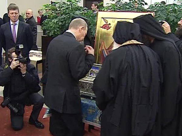 Ο πρωθυπουργός της Ρωσίας κ. Πούτιν προσκύνησε με ευλάβεια την Αγία Ζώνη, χαιρέτησε εγκάρδια τον Ηγούμενο της Μονής Βατοπαιδίου γέροντα Εφραίμ, τον οποίο ευχαρίστησε για τη θυσία και τον κόπο που ανέλαβε προκειμένου να ανταποκριθεί στην πρόσκληση του Αγιωτάτου Πατριάρχου Μόσχας κ. Κύριλλου και στην επιθυμία του ρωσικού λαού να επισκεφθεί η Αγία Ζώνη τη ρωσική γη.