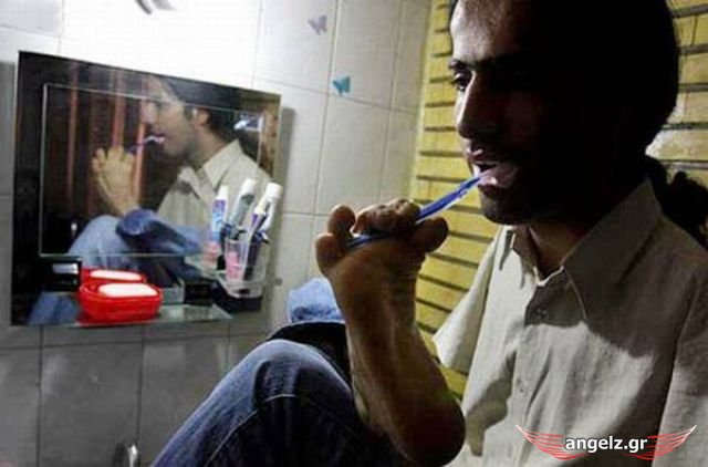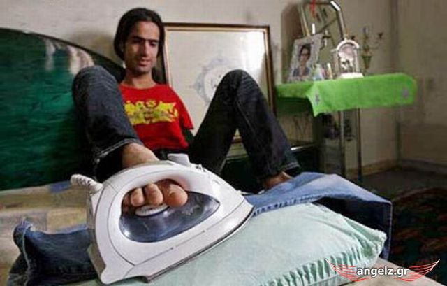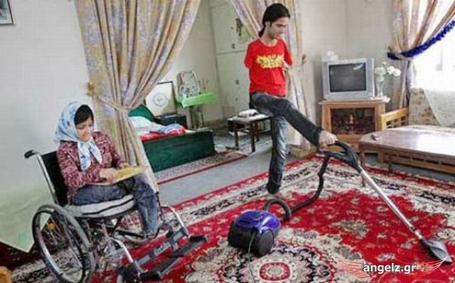 Αυτός κάνει τα πάντα με τα πόδια του. Επιπλέον, στην καθημερινή τους ζωή κάνουν όλες τις δουλειές του σπιτιού χώρις κάνεναν να τους βοηθάει. Είναι καταπληκτικό ζευγάρι!!