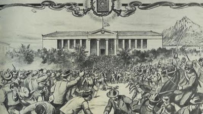 Όταν κάποιοι «εν εθνική μέθη τελούντες» επιχείρησαν να παραβιάσουν την πύλη της Βουλής και να ζητήσουν την παραίτηση της κυβέρνησης Γεωργίου Θεοτόκη, και άλλοι θέλησαν να καταλάβουν το κτίριο της Αρχιεπισκοπής «διά να φρονηματίσουν» τον Αρχιεπίσκοπο, η Χωροφυλακή —καθώς δεν υπήρχε Αστυνομία τότε— «εδοκίμασε επί κεφαλών (των διαδηλωτών) άμετρον βίαν». Τα επεισόδια έλαβαν μεγάλες διαστάσεις.