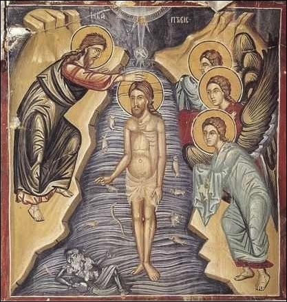 Ὁ Χριστός παριστάνεται ὀρθός ἐνάντια πρός τό βυθό τοῦ νεροῦ σκεπασμένος ἀπό τά κύματα τοῦ Ἰορδάνη. Ἀπό τήν ἀρχή τῆς ἀποστολῆς του, ὁ Ἰησοῦς ἀντιμετωπίζει τά κοσμικά στοιχεῖα πού περιέχουν σκοτεινές δυνάμεις: τό νερό, τόν ἀέρα καί τήν ἔρημο. Ἡ διάβαση τῆς Ἐρυθρᾶς Θαλάσσης εἶναι ἀπό τίς μορφές τοῦ βαπτίσματος: ἡ νίκη ἀπό τό Θεό τοῦ δράκοντος τῆς θαλάσσης, τοῦ τέρατος Rahab. Ἕνα ἰδιόμελο τῆς ἑορτῆς κάνει νά κατανοήσουμε τόν Κύριο λέγοντας στόν Ἰωάννη Βαπτιστή: Προφήτη, ἔλα νά μέ βαπτίσεις… Βιάζομαι νά χαθεῖ ὁ κρυμμένος στά νερά ἐχθρός, ὁ πρίγκηπας τοῦ σκότους, γιά νά ἀπελευθερώσω τόν κόσμο ἀπό τά δίχτυα του παραχωρώντας του τήν αἰώνια ζωή. Ἔτσι, μπαίνοντας στόν Ἰορδάνη ὁ Κύριος, καθαρίζει τά νερά: Σήμερα τά κύματα τοῦ Ἰορδάνη μεταβάλλονται σέ φάρμακο καί ὅλη ἡ δημιουργία ποτίζεται μέ μυστικά κύματα… (εὐχή ἁγίου Σωφρονίου). Εἶναι ὅλο τό σύμπαν πού δέχεται τήν ἁγιοποίησή του: Ὁ Χριστός βαπτίζεται· βγαίνει ἀπό τό νερό καί μέ αὐτό ἀποκαλύπτει τόν κόσμο (ἰδιόμελο τοῦ Κοσμᾶ). Σπάζει τό κεφάλι τῶν δρακόντων καί ἀναζωογονεῖ τόν Ἀδάμ, εἶναι ἡ ἀνάπλαση τῆς ἀνθρωπίνης ὑπάρξεως, ἡ ἀναγέννησή της στό καθαριστικό λουτρό τοῦ μυστηρίου. Ὁ Δίδυμος Τυφλός καθορίζει: «ὁ δέ Κύριος ἔδωκέ μοι μητέρα τήν κολυμβήθραν (Ἐκκλησία), πατέρα τόν Ὕψιστον, ἀδελφόν τόν δι ̉ ἡμᾶς βαπτισθέντα Σωτῆρα».