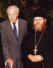 Ο Σερ Στήβεν Ράνσιμαν με τον Ηγούμενο της Ιεράς Μεγίστης Μονής Βατοπαιδίου αρχιμανδρίτη Εφραίμ.