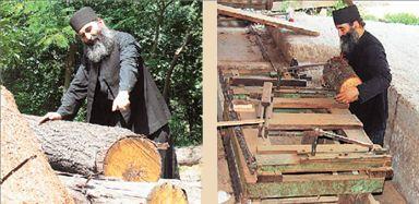 Ξεχόντρισμα, πλάνισμα, δημιουργία προφίλ, όλα γίνονται εκεί μέσα. Αν υπάρχει ρόζος θα γίνει ξύλο για τη σκεπή, τα κοντά ξυλάκια, που φαίνονται να περισσεύουν, τελικά δεν περισσεύουν γιατί χάρη σε ειδικό μηχάνημα συγκόλλησης αυξημένης πίεσης, με ένα πανέξυπνο σύστημα, τελειοποιημένο από τον πατέρα Σεραφείμ, που αν και αυτοδίδακτος διαθέτει πολύ στέρεες γνώσεις μηχανικής, τα κολλούν μεταξύ τους και δημιουργούν ξύλινες πλάκες. Αυτές που μπορούν να γίνουν με τη σειρά τους τρούλοι, βιβλιοθήκες, παράθυρα, πατώματα σε διάφορες περίτεχνες εκκλησιαστικές κατασκευές που όταν τις βλέπεις λες πως έχουν βγει από το πιο προχωρημένο εργοστάσιο ξυλουργίας. Ακόμη και εκείνα τα πρώτα κομμάτια που προκύπτουν στην πρώτη επαφή της μηχανής με τον κορμό, τα καπάκια, αν και φαίνονται τελείως άχρηστα στο Όρος δεν πετιούνται και τα συναντάς στο πλάι του μοναστηριακού μονοπατιού να το στηρίζουν έξυπνα και να το διαμορφώνουν αρμονικά μέσα στο υπόλοιπο τοπίο. Τα δέντρα του μοναστηριακού δάσους κόβονται με σύνεση και με την έγνοια ποτέ να μη λιγοστέψουν. Η «κτίση» αντιμετωπίζεται σαν κληρονομιά που πρέπει να παραδοθεί τουλάχιστον όπως παρελήφθη, αφού όπως λέει ο ηγούμενος της Μονής Ξενοφώντος γέροντας Αλέξιος: «Εδώ είμαστε όλοι φερτοί, αλλά μην ξεχνάτε ότι η αγάπη είναι εφευρετική…».