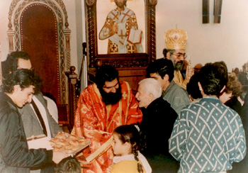 Έσκυψα να μου ευχηθεί, εγώ είμαι πανύψηλος, αυτός ήταν κοντός άνθρωπος, ήρθε με τη βρακούδα του, επαραμέρισαν όλοι – δείγμα του σεβασμού που ετύγχανε σε όλη τη Λάρνακα – και έσκυψα, φαίνεται στη φωτογραφία, για να τον ακούσω. Και μου είπε με αυτή τη στεντόρεια φωνή του «ά ξ ι ο ς! και σ ’ανώωωτερα …» κι όπως έδειξε, «και εις ανώτερα», εγώ γύρισα το κεφάλι και είδα τον Κιτίου που έδινε δίπλα το αντίδωρο.