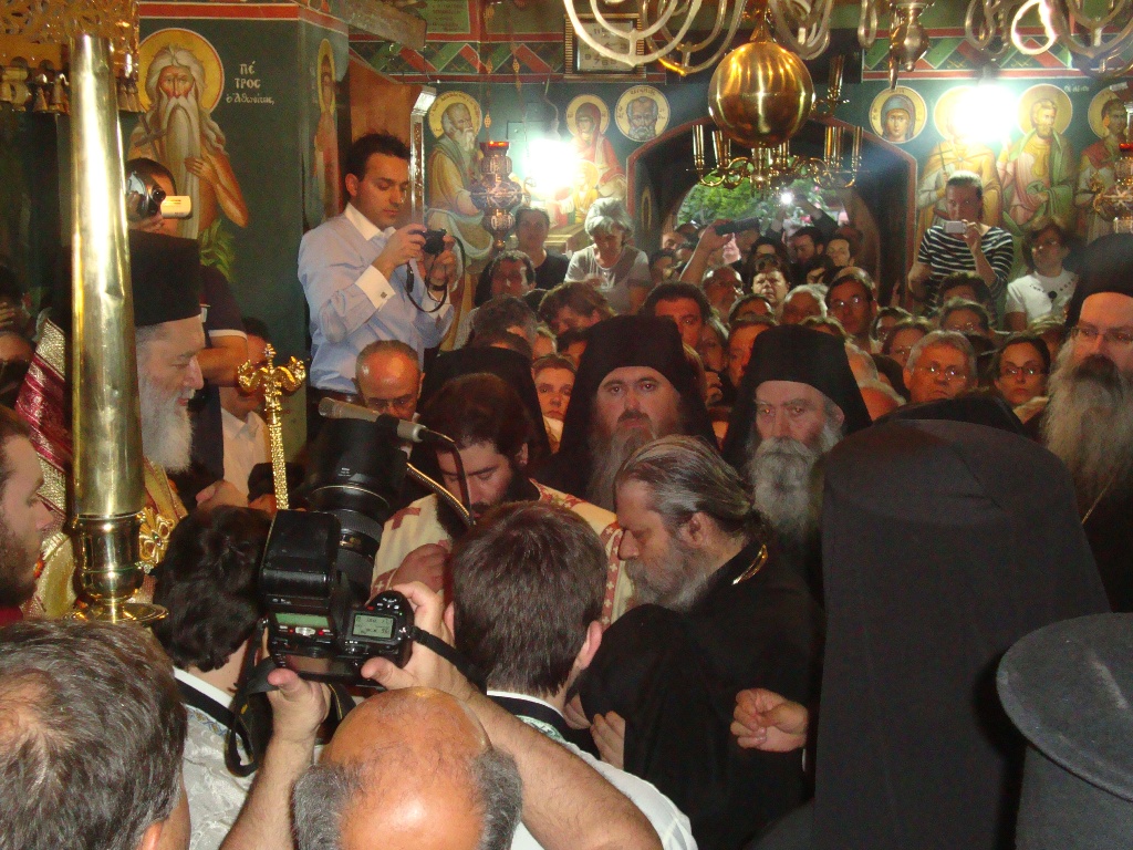 Μετά την Απόλυση του Εσπερινού, ο νέος Ηγούμενος δέχθηκε τις ευχές των Κληρικών και των λαϊκών αδελφών και στο τέλος πραγματοποίησε τρισάγιο στους τάφους των δύο μακαριστών Γερόντων Ιακώβου Τσαλίκη (+1991) και του προ 40 ημερών κοιμηθέντος Κυρίλλου Γεραντώνη, του και αμέσου προκατόχου του.