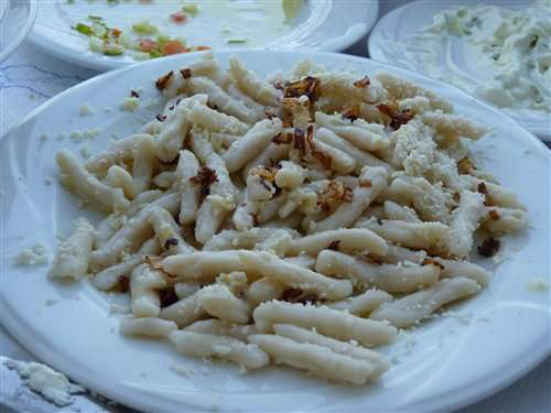 Αναμειγνύετε το αλεύρι με το νερό και ζυμώνετε το μείγμα μέχρι να σχηματιστεί μια μαλακή ζύμη. Την κόβετε σε κομμάτια και τα πλάθετε σε χοντρά κορδόνια. Κόβετε τα κορδόνια σε μικρότερα κομμάτια και τα πιέζετε στις άκρες τους, ώστε να σχηματίσετε τις μακαρούνες, που θα μοιάζουν με τεράστιο κριθαράκι. Τις απλώνετε σε ένα αλευρωμένο ταψί και τις αφήνετε για περίπου 1 ώρα, μέχρι να στεγνώσουν. Στη συνέχεια τις βράζετε σε άφθονο αλατισμένο νερό. Μόλις ανέβουν στην επιφάνεια της κατσαρόλας, τις σουρώνετε και κρατάτε περίπου μισή κουτάλα της σούπας από το νερό όπου έβρασαν.