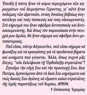 Όπως ανηγγέλθη στο προηγούμενο φύλλο, την Κυριακή των αγ. Πατέρων της Α Οἰκ. Συνόδου 27-5-2012 επραγματοποιήθη στην Κύπρο από την ι. μητρόπολι Ταμασού και Ορεινής και την Χριστιανική Ένωσι Κυπρίων Επιστημόνων (Χ.Ε.Κ.Ε.) εκδήλωσις – αφιέρωμα στον αείμνηστο μητροπολίτη Φλωρίνης Αυγουστίνο με θέμα «ΜΗΤΡΟΠΟΛΙΤΗΣ ΦΛΩΡΙΝΗΣ ΑΥΓΟΥΣΤΙΝΟΣ (ΚΑΝΤΙΩΤΗΣ): ΕΝΑΣ ΑΓΩΝΙΣΤΗΣ ΟΡΘΟΔΟΞΟΣ ΙΕΡΑΡΧΗΣ».