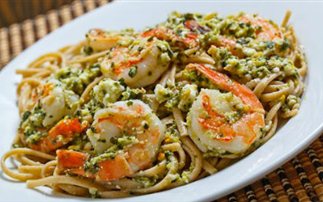 Σερβίρετε με τις γαρίδες και τη σάλτσα πέστο σε βαθύ πιάτο.