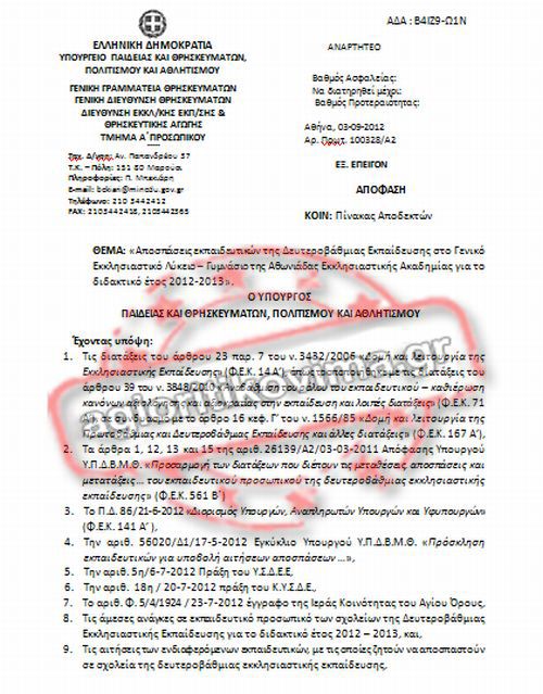 ΘΕΜΑ: «Αποσπάσεις εκπαιδευτικών της Δευτεροβάθμιας Εκπαίδευσης στο Γενικό Εκκλησιαστικό Λύκειο – Γυμνάσιο της Αθωνιάδας Εκκλησιαστικής Ακαδημίας για το διδακτικό έτος 2012-2013».