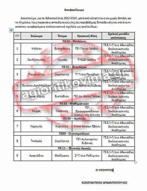 Αποσπούμε, για το διδακτικό έτος 2012-2013, μετά από αίτησή τους και χωρίς δαπάνη για το δημόσιο, τους παρακάτω εκπαιδευτικούς της Δευτεροβάθμιας Εκπαίδευσης και στο έναντι εκάστου αναφερόμενο εκκλησιαστικό σχολείο ως ακολούθως: