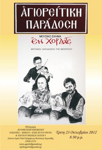Το Εν Χορδαίς είναι ένα από τα σημαντικότερα και πλέον καταξιωμένα Μουσικά Σχήματα στο χώρο των Μουσικών Παραδόσεων της Μεσογείου. Με ευρύ ρεπερτόριο και φρέσκια παιγνιώδη παρουσία επί σκηνής, έχει περιοδεύσει με μεγάλη επιτυχία σε όλο τον κόσμο αποσπώντας διθυραμβικές κρητικές. Το 2008 τιμήθηκε με το βραβείο της γαλλικής Ραδιοφωνίας Prix France Musique des Musiques du Monde, ενώ το 2006 αποτέλεσε την επίσημη ελληνική υποψηφιότητα για τα βραβεία Sharjah της Unesco. Το μουσικό σχήμα Εν Χορδαίς θα έχουμε την ευκαιρία να απολαύσουμε  στον πολυχώρο της Αγιορείτικης Παράδοσης την Τρίτη 23 Οκτωβρίου 2012 και ώρα 8:30 μ.μ. στον Λαγκαδά απέναντι από τον ναό της Κοιμήσεως Θεοτόκου. Το Μουσικό σχήμα είναι διεθνώς γνωστό με την καλλιτεχνική του δεξιοτεχνία και το εκπαιδευτικό και επιστημονικό του έργο.  Συναυλίες, με επίκεντρο την μουσική της Ανατολικής Μεσογείου και την ελληνική μουσική κληρονομιά, γεμίζουν το ιστορικό του. Πιστεύουμε ότι και με αυτή την συναυλία θα εντυπωσιάσει και θα αναδείξει την πολύτιμη μουσική μας κληρονομιά. Οι δεξιοτέχνες και συντελεστές του Μουσικός Σχήματος είναι οι:
