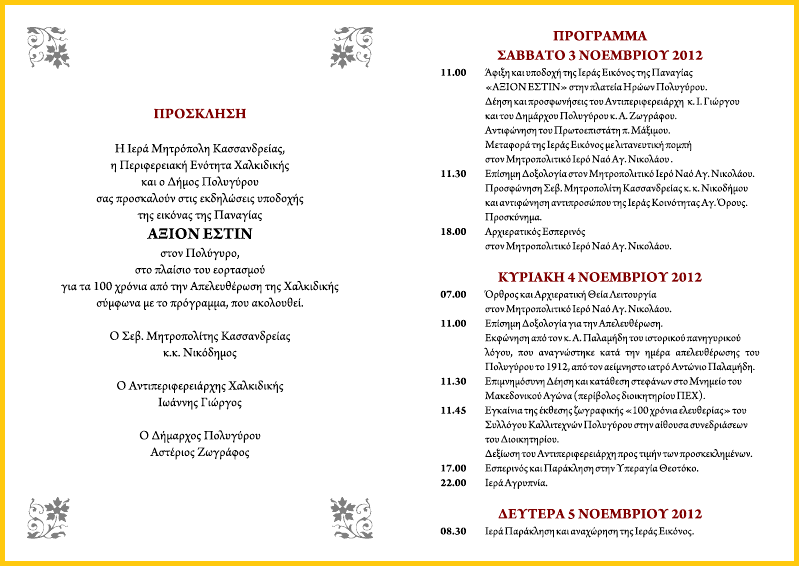 Η υποδοχή της Ιεράς Εικόνος, η οποία θα συνοδεύεται από τα μέλη της Ιεράς Κοινότητος του Αγ. Όρους, θα πραγματοποιηθεί το Σάββατο 3 Νοεμβρίου 2012, ώρα 11 το πρωί στην πλατεία Ηρώων, του Πολυγύρου.