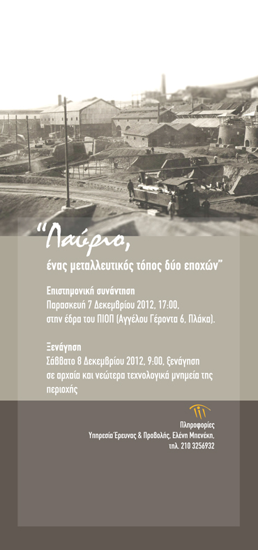 Στο πλαίσιο σειράς παρόμοιων δράσεων, το Π.Ι.Ο.Π. διοργανώνει επιστημονική συνάντηση την Παρασκευή 7 Δεκεμβρίου 2012, 17:00, στην έδρα του, Αγγέλου Γέροντα 6, Πλάκα. Tο πρόγραμμα της συνάντησης περιλαμβάνει ανακοινώσεις που αφορούν την αρχαία και τη νεώτερη ιστορία του Λαυρίου.