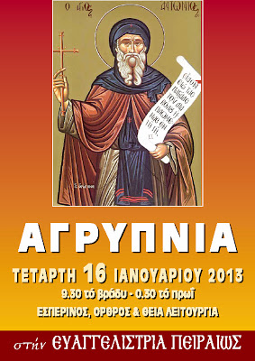 Τετάρτη 16 Ιανουαρίου 2013 – Αγρυπνία στην Ευαγγελίστρια Πειραιώς 15 Ιανουαρίου 2013 Πηγή:synodoiporia.blogspot.it Tags:Τετάρτη 16 Ιανουαρίου 2013 - Αγρυπνία στην Ευαγγελίστρια Πειραιώς