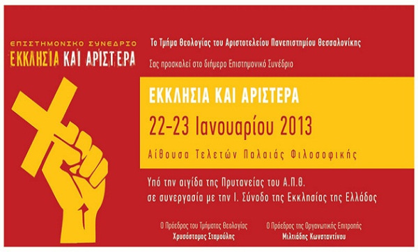 Ένα Συνέδριο, μάλλον πρωτότυπο και οπωσδήποτε «διαφορετικό από τα υπόλοιπα», πρόκειται να λάβει χώρα στη Θεολογική Σχολή του Αριστοτελείου Πανεπιστημίου Θεσσαλονίκης. Συγκεκριμένα, το Τμήμα Θεολογίας του Α.Π.Θ. διοργανώνει διήμερο Συνέδριο στις 22-23 Ιανουαρίου 2013, στο οποίο συμμετέχουν εκπρόσωποι της Εκκλησίας της Ελλάδος, πολιτικά κόμματα από το χώρο της κοινοβουλευτικής αριστεράς και ακαδημαϊκοί δάσκαλοι. Το Συνέδριο τελεί υπό την αιγίδα της Πρυτανείας του Α.Π.Θ. σε συνεργασία με την Ιερά Σύνοδο της Εκκλησίας της Ελλάδος. Το συντονισμό των συζητήσεων θα αναλάβουν διακεκριμένοι δημοσιογράφοι της χώρας. Όλες οι Συνεδρίες θα πραγματοποιηθούν στην Αίθουσα Τελετών του κτιρίου της Παλαιάς Φιλοσοφικής Σχολής. Ο τίτλος του Συνεδρίου είναι: «Εκκλησία και Αριστερά» και το πρόγραμμά του έχει ως εξής: Διαβάστε τη συνέχεια του άρθρου »