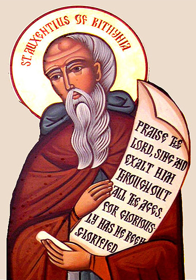 Τῆς ἐρήμου πολίτης καί ἐν σώματι ἄγγελος, καί θαυματουργός ἀνεδείχθης, θεοφόρε Πατήρ ἡμῶν Αὐξέντιε· νηστείᾳ ἀγρυπνίᾳ προσευχῇ, οὐράνια χαρίσματα λαβών, θεραπεύεις τούς νοσοῦντας, καί τάς ψυχάς τῶν πίστει προστρεχόντων σοι. Δόξα τῷ δεδωκότι σοι ἰσχύν, δόξα τῷ σέ στεφανώσαντι, δόξα τῷ ἐνεργοῦντι διά σοῦ πᾶσιν ἰάματα.