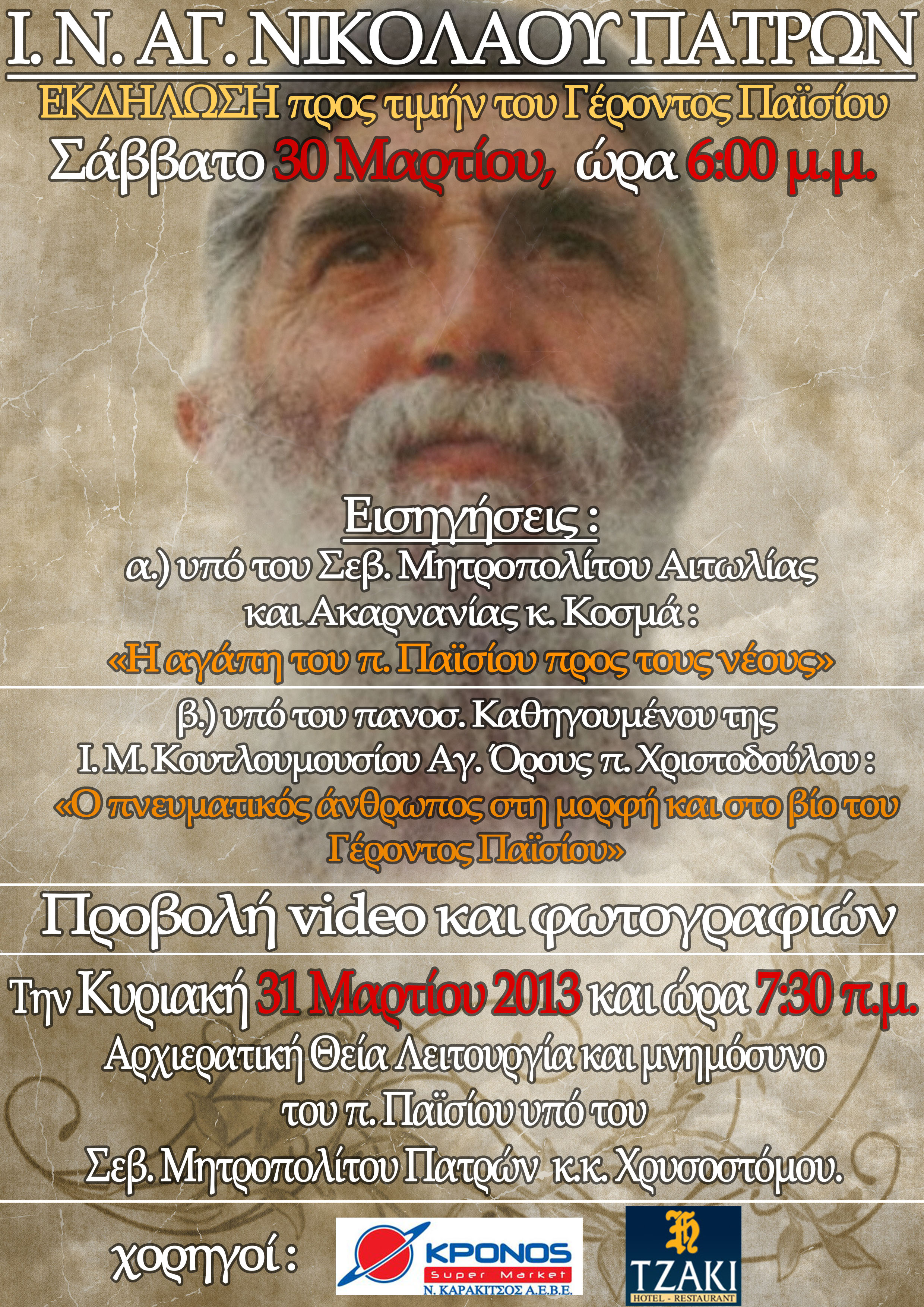 Εκδήλωση προς τιμήν του Γέροντος Παϊσίου στον Ι. Ν. Αν. Νικολάου Πατρών
