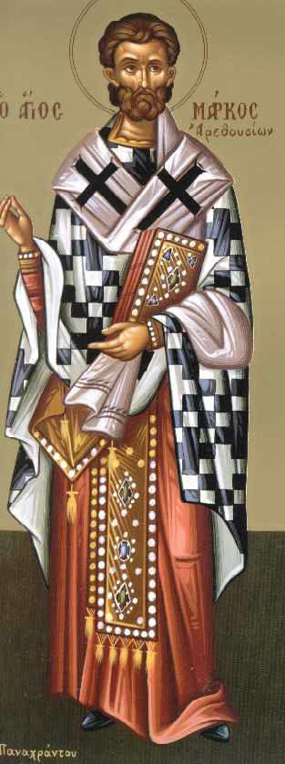 Ο Άγιος Μάρκος ήταν επίσκοπος Αρεθουσίων και ήκμασε στα χρόνια του Μ. Κωνσταντίνου και του βασιλέως Κωνσταντίου (337-361 μ.Χ.). Το έτος 341 μ.Χ. συμμετείχε στην Σύνοδο της Αντιόχειας. Στα Πρακτικά μάλιστα αυτής, διασώζεται «Έκθεσις Πίστεως Μάρκου Αρεθουσίων». Το επόμενο έτος συμμετείχε στην αντιπροσωπεία Επισκόπων, η οποία μετέβη στα Τρέβηρα για να συναντήσει τον αυτοκράτορα Κώνσταντα. Το έτος 343 μ.Χ. έλαβε μέρος στην Σύνοδο της Φιλιππουπόλεως και το έτος 351 μ.Χ. στην Σύνοδο του Σιρμίου, η οποία καταδίκασε τον Φωτεινό, Επίσκοπο Σιρμίου, ως οπαδό του αιρετικού Επισκόπου Αγκύρας, Μαρκέλλου. Τον συναντάμε, επίσης, στην Σύνοδο της Σελευκείας της Ισαυρίας, το έτος 358 μ.Χ. Μια μέρα, κινούμενος από θείο ζήλο, γκρέμισε ένα ναό των ειδώλων και τον έκανε εκκλησία. Όταν όμως ανέλαβε αυτοκράτωρ ο Ιουλιανός ο Παραβάτης, συνέλαβε το Μάρκο, διότι γκρέμισε τον ειδωλολατρικό ναό. Τότε οι στρατιώτες, αφού τον γύμνωσαν και τον μαστίγωσαν αλύπητα, τον έριξαν μέσα σε χαντάκια με βρώμικο νερό. Μετά τον έβγαλαν από ‘κει, και τον παρέδωσαν σε μικρά παιδιά, να τον τρυπούν με βελόνες. Έπειτα, έβρεξαν το σώμα του με άλμη. Κατόπιν τον άλειψαν με μέλι και τον κρέμασαν ανάποδα στον ήλιο, για να είναι τροφή στις μέλισσες και στις σφήκες. Όλα αυτά τα βάσανα ο Μάρκος τα υπέστη με ανδρεία και πολλή υπομονή. Οπότε, βλέποντας οι ειδωλολάτρες αυτή την ανδρεία και μεγαλοψυχία του γέροντα Μάρκου, έγινε στις ψυχές τους μέγα θαύμα. Αφού τον κατέβασαν από ‘κει που τον είχαν κρεμασμένον, μετενόησαν, έγινε διδάσκαλος τους και έμαθαν άπ’ αυτόν την αληθινή πίστη. Ο Άγιος Μάρκος κοιμήθηκε με ειρήνη.