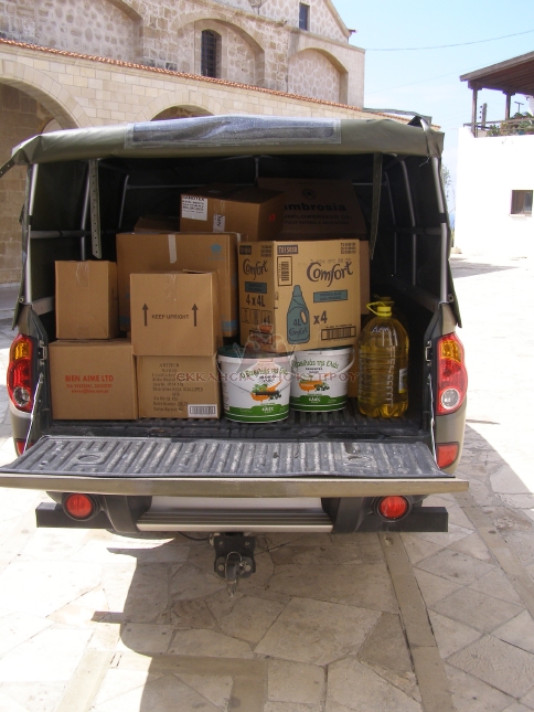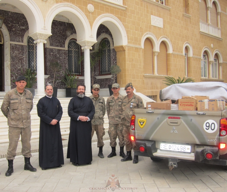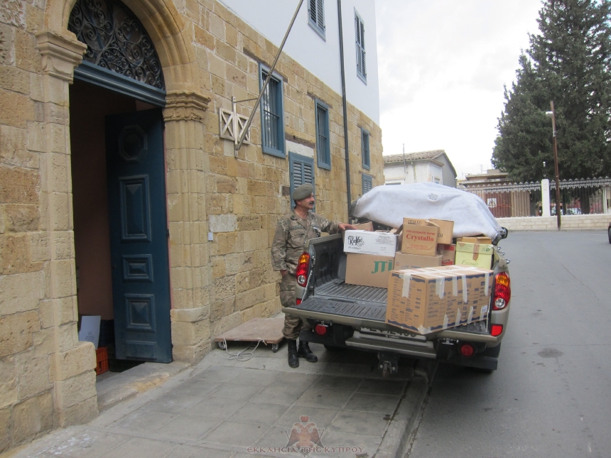 Τα τρόφιμα παρέλαβε, εκ μέρους του Μακαριωτάτου Αρχιεπισκόπου Κύπρου κ.κ. Χρυσοστόμου, ο Θεοφιλέστατος Επίσκοπος Μεσαορίας κ. Γρηγόριος πλαισιούμενος από τον Διευθυντή Θρησκευτικού Γ.Ε.Ε.Φ. Αρχιμανδρίτη Ιωάννη Ιωάννου.