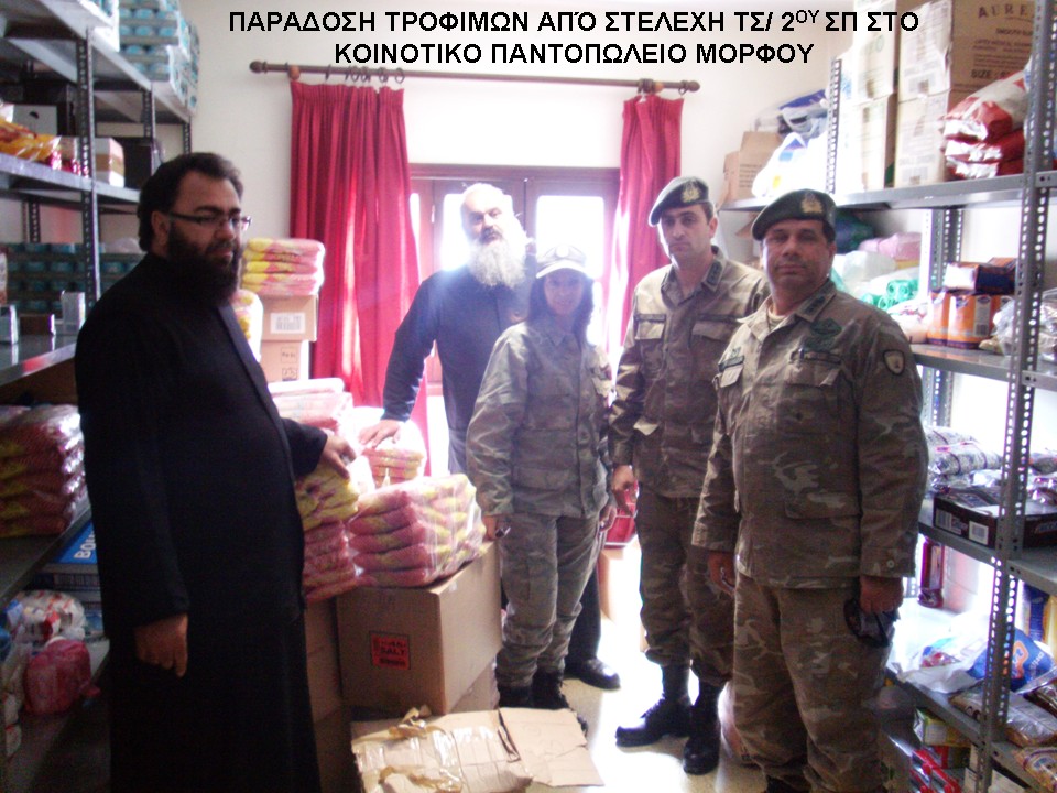 Τα μόνιμα στελέχη του 2ου Συντάγματος Πεζικού και των μονάδων που εδρεύουν στην περιοχή ευθύνης, ημέρα Παρασκευή, 19 Απριλίου 2013 με πνεύμα πατριωτισμού, αλληλεγγύης και ανιδιοτελούς προσφοράς, παρουσία επικεφαλής Αξιωματικού, διέθεσαν τρόφιμα για ενίσχυση του Κοινωνικού Παντοπωλείου της Ιεράς Μητροπόλεως Μόρφου, με σκοπό την απάμβλυνση των αναγκών δυσπραγούντων αδελφών μας που περιήλθαν σε οικονομική δυσχέρεια ένεκα της οικονομικής κρίσης που μαστίζει την κοινωνία μας.