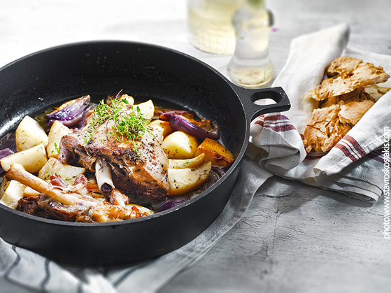 Βάζουμε όλα τα υλικά σε μικρό πήλινο σκεύος ή σε σκεύος που να σφραγίζει καλά, δηλαδή μαντεμένια γάστρα ή μαντεμένια κατσαρόλα με βαρύ καπάκι. Προσθέτουμε το ελαιόλαδο και το κρασί. Αλατοπιπερώνουμε και προσθέτουμε τα μυρωδικά. Σκεπάζουμε με το καπάκι.