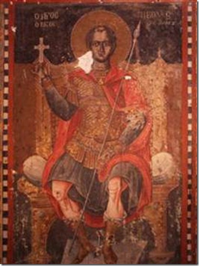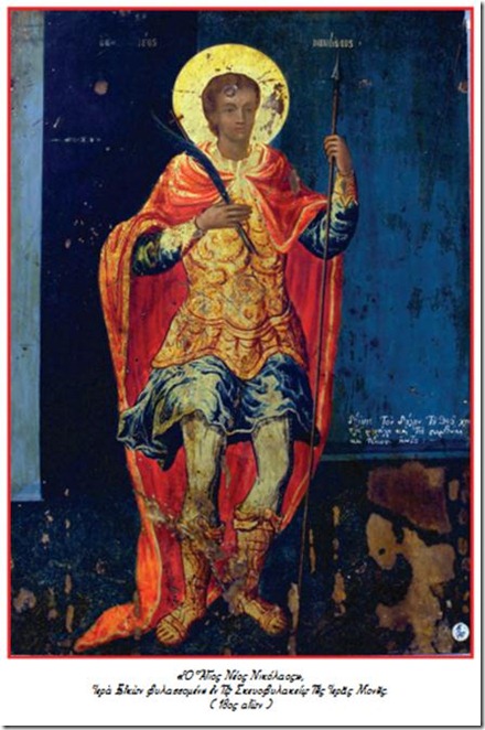 – Η απόδοση του Αγίου, ως νεαρού έφιππου στρατιωτικού. Θαυματουργή τοιχογραφία από το τέμπλο της Ιεράς Μονής του Οσιομάρτυρος Νικολάου στο χωριό Υψηλάντη Βοιωτίας.