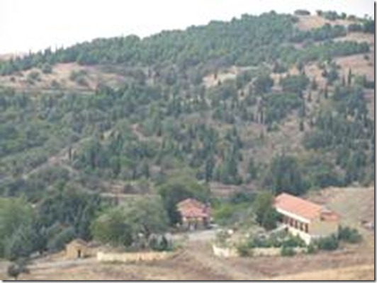 Η περιοχή του μαρτυρίου του αγίου Νικολάου του Νέου. Δεξιά ο ξενώνας του Προσκυνήματος. Στο κέντρο ο φερώνυμος προσκυνηματικός ναός στα Βούναινα και γύρο του οι φτελιές.