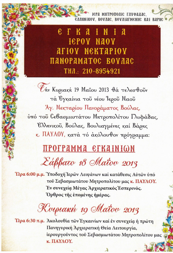 Εγκαίνια Ιερού Ναού Αγίου Νεκταρίου Βούλας 18 και 19 Μαΐου 2013