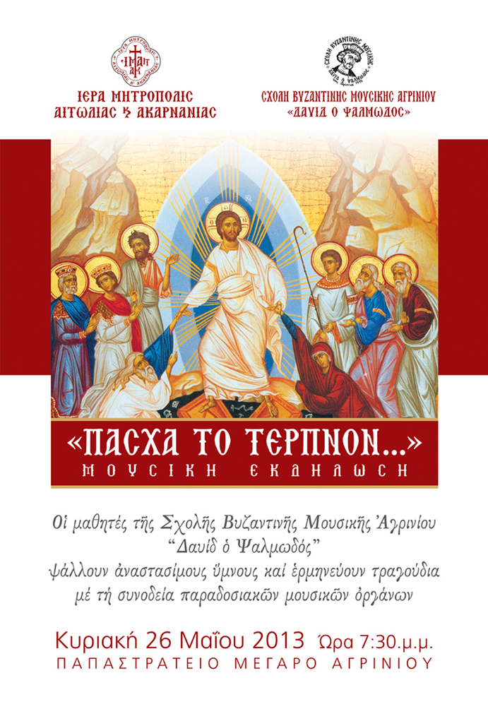 Η Σχολή Βυζαντινής Μουσικής Αγρινίου «Δαυίδ ο Ψαλμωδός» της Ιεράς Μητροπόλεως Αιτωλίας και Ακαρνανίας, με την ευκαιρία της λήξεως των μαθημάτων του σχολικού έτους 2012 – 2013, θα πραγματοποιήσει Μουσική Εκδήλωση με τίτλο «Πάσχα το τερπνόν…».
