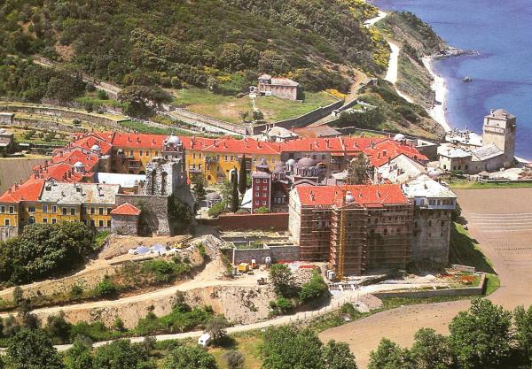 Το Μοναστήρι των Ιβήρων είναι τρία τέταρτα της ώρας από τις Καρυές. Κατήφορος μέσα από το δάσος, πού απλώνεται σε ένα ατέλειωτο πράσινο παρασόλι, σχεδόν ως την είσοδο του Μοναστηρίου. Οι πανύψηλες άσπρες κολώνες του κρατούν αγέρωχα ένα μακρύ μπαλκόνι, χάσκοντας στο μάκρος του τοίχου, πού αρχίζει λίγο πιο πάνω από το γιαλό, και τελειώνει εκεί πού φουντώνουν οι πράσινοι λόφοι, με τελευταία γραμμή τους τον χιονισμένο τόνο του Άθωνα.