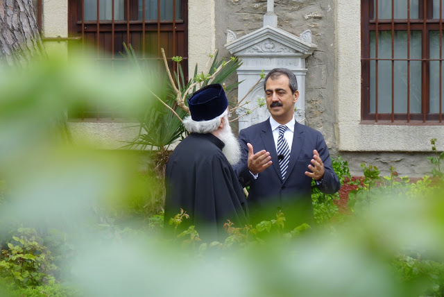 Ο Λάκης Βίγκας, Άρχων Χαρτοφύλαξ της Μ.τ.Χ.Ε., εκπρόσωπος των μειονοτήτων στη Γενική Διεύθυνση Βακουφίων που εδρεύει στην Άγκυρα και πρόεδρος της Κοινότητος Νεοχωρίου στο Βόσπορο, συνομιλεί με τον Σεβ. Μητροπολίτη Δημητριάδος Ιγνάτιο στο νέο Αρχονταρίκι.