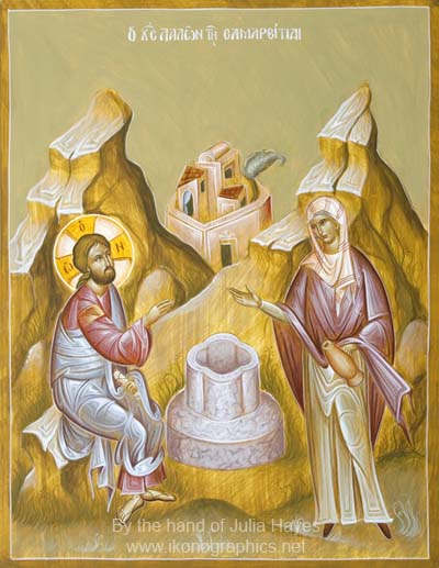 Εκεί ήταν η πηγή του Ιακώβ, το πηγάδι που εκείνος είχε ανοίξει. Κουρασμένος ο Κύριος από την οδοιπορία κάθισε μόνος του δίπλα από το πηγάδι και κάτω αφελώς, γιατί οι μαθητές του πήγαν να αγοράσουν τροφές. Έρχεται εκεί μια γυναίκα από τη Σαμάρεια να πάρει νερό και ο Κύριος διψώντας ως άνθρωπος, της ζήτησε νερό.