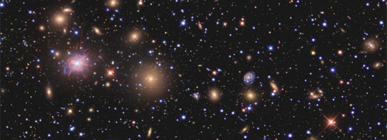 Αυτή η πολύχρωμη θέα είναι γεμάτη με γαλαξίες που βρίσκονται σχεδόν 250 εκατομμύρια έτη φωτός μακριά, και είναι οι γαλαξίες του σμήνους Περσέα. Το εκτεταμένο και μερικές φορές εκπληκτικό σχήμα τους φαίνεται πέρα από ένα πέπλο αστεριών του δικού μας γαλαξία σε πρώτο πλάνο.