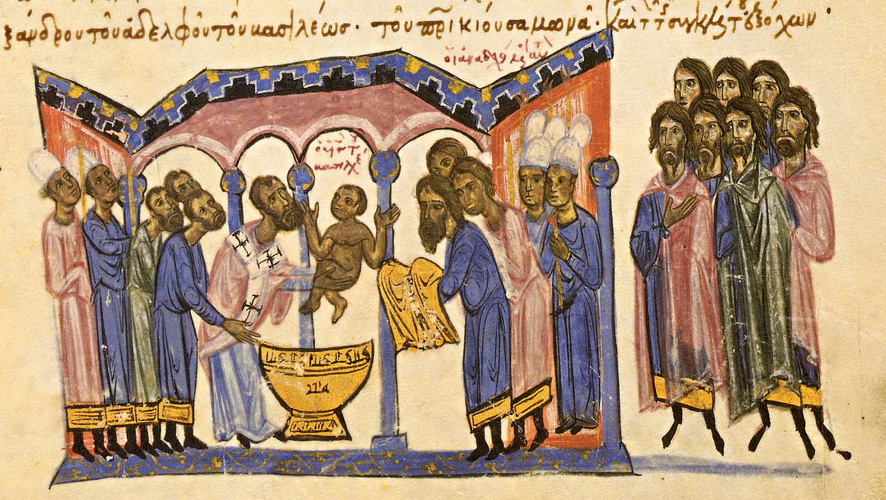 Μικρογραφία σε χειρόγραφο.  Αναπαράσταση βάπτισης νηπίου.  (©Σύνοψις Ιστοριών Ιωάννου Σκυλίτζη, Ισπανία, Μαδρίτη, Εθνική Βιβλιοθήκη)