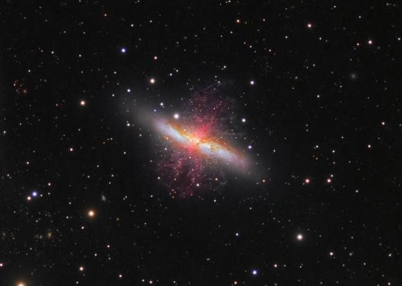 Ενεργοποιημένη από μια στενή επαφή με τον κοντινό μεγάλο γαλαξία M81, η λυσσαλέα έκρηξη σχηματισμού νέων άστρων στον M82 θα πρέπει να διαρκέσει περίπου 100 εκατομμύρια χρόνια. Ο M82 είναι 12 εκατομμύρια έτη φωτός μακριά, κοντά στο βόρειο όριο της Μεγάλης Άρκτου.