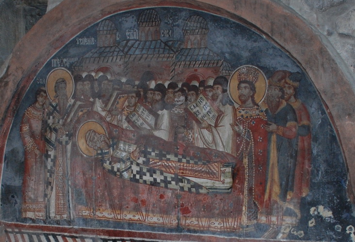 Τοιχογραφία. Κόσοβο, Πατριαρχείο του Ιππεκίου, Αναπαράσταση της κοίμησης του Αγίου Σάββα.