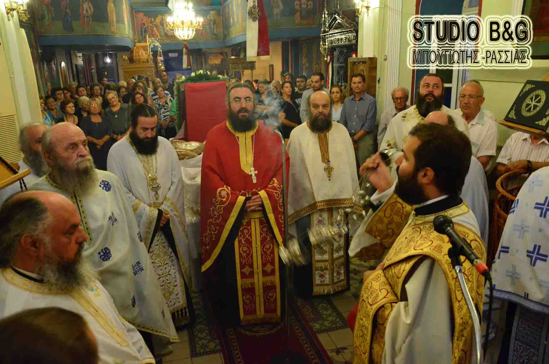 Την παραμονή της εορτής Τρίτη 28 Αυγούστου τελέσθηκε ο Μέγας πανηγυρικός Εσπερινός μετ’ αρτοκλασίας και θείου κηρύγματος χοροστατούντος του ιεροκήρυκα της Μητροπόλεως Αργολίδος αρχιμανδρίτη Χρυσοστόμου Παπουλέση και με την παρουσία ιερέων από την ευρύτερη περιοχή της Αργολίδος. Στο τέλος του Εσπερινού έγινε η λιτάνευσης της Ιεράς Εικόνος του Τιμίου Προδρόμου παιανιζούσης της δημοτικής φιλαρμονικής της Νέας Κίου. Το παρών τους έδωσαν μεταξύ άλλων ο δήμαρχος Άργους Μυκηνών Δ. Καμπόσος, σύμβουλος του πρωθυπουργού Α.Σαμαρά στα θέματα αθλητισμού,οι δημοτικοί σύμβουλοι Δ. Κρίγκος, Χασάπης Αναγνώστου κα.